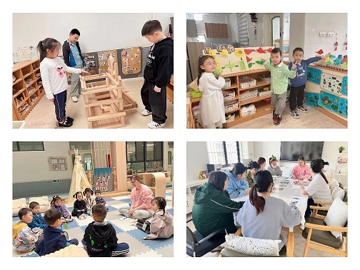 活动伊始,教学负责人潘老师和作为观察者的各班老师们商讨活动的开展,围绕观察的视角、观察的内容以及记录的方式达成了共识。随后相继进入各班班级聆听幼儿代表对自己班级环境、游戏、个别化等内容的介绍。